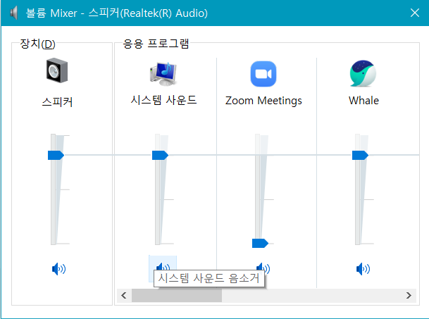 3. 저 같은 경우에는 Zoom Meetings의 볼륨이 꺼져 있어서 안들렸더라구요! 여러분도 혹시 소리가 안나는 프로그램의 볼륨바가 맨 아래에 위치하고 있는 지 확인해보시기 바랍니다.