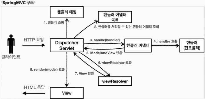 저번 수업시간에 만들어본 MVC 버전5는 스프링 MVC와 매우 유사하다. 스프링은 viewResolver나 View를 인터페이스로 만들어서 확장성이 더 좋다. 그리고 스프링 MVC에서 프론트 컨트롤러는 Dispatcher Servlet 이다.