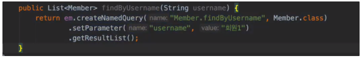 문제는 createQuery하고 setParameter ~ getResultList~ 하는게 좀 번거롭다. 그래서 스프링 데이터 jpa에서 제공하는 네임드쿼리는 조금 더 쉽다.