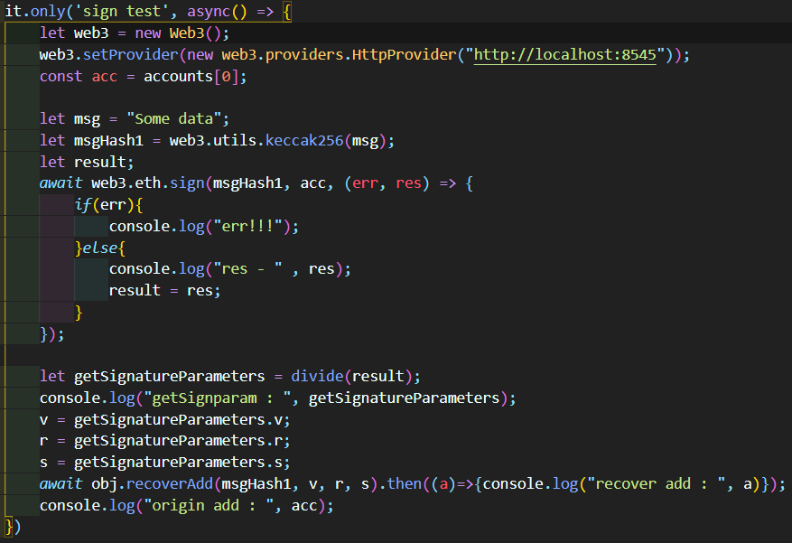해당 서명값의 v,r,s 값을 스마트 컨트랙트의 recoverAdd 함수로 넘겨서 서명자의 주소값을 복원합니다.