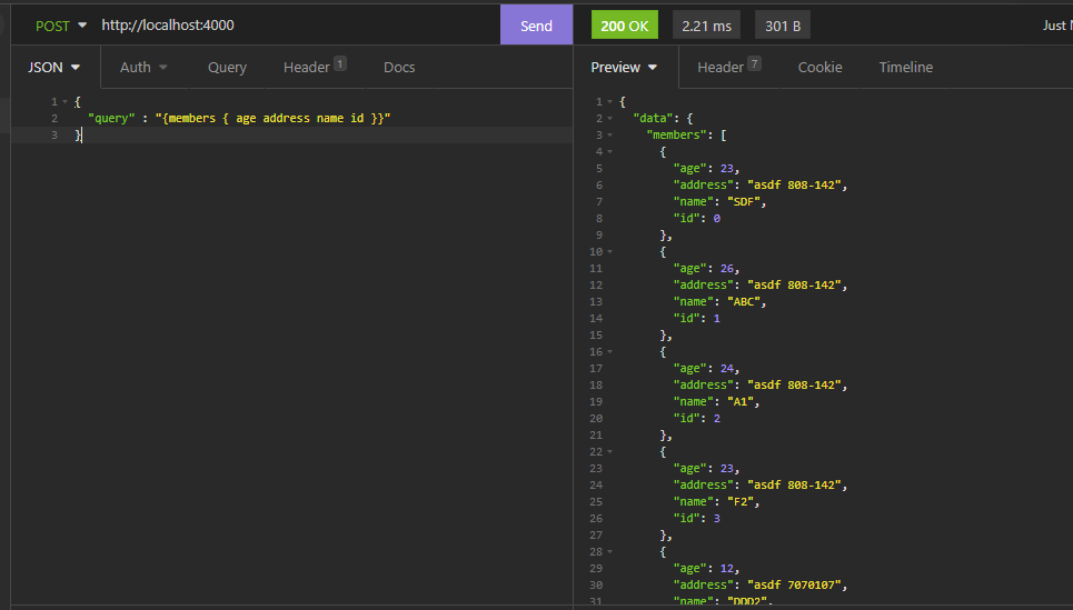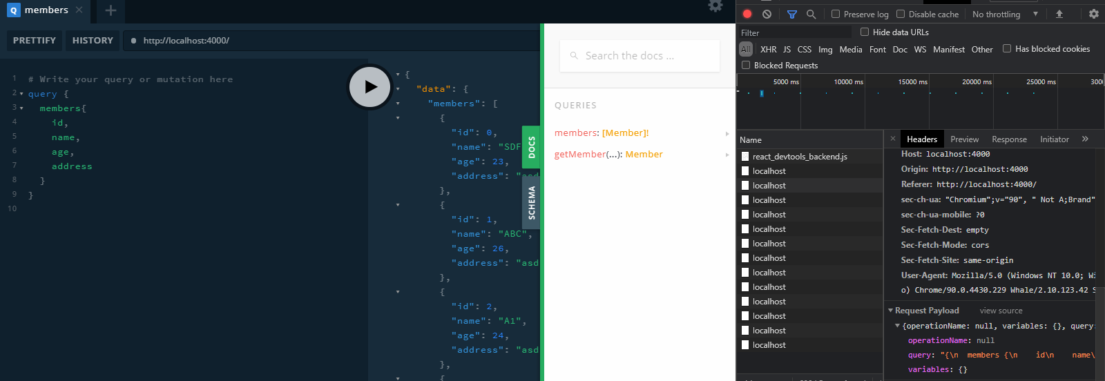 members 로 요청하면 응답 데이터의 형식은 Member 객체 배열이고 getMember 라는 함수를 호출하면 응답 데이터는 Member 객체임을 알려주는 것이다. 이제 요청에 대해 실제로 응답해주는 것은 resolvers.js에서 해줘야한다.