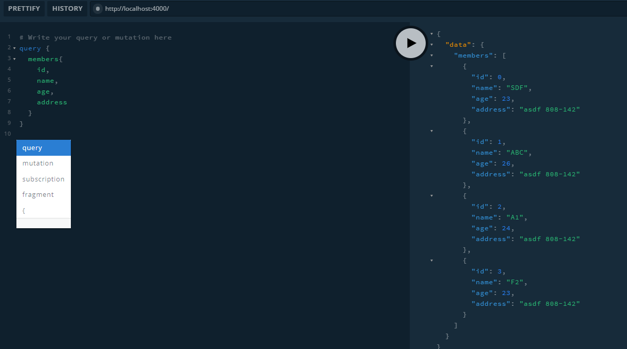 GraphQL playground를 통해 실습해봤다. 데이터는 이렇게 원하는 형식대로 지정이 가능하다.