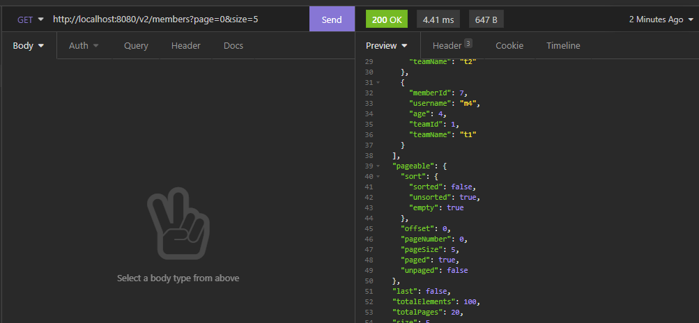 page와 size를 파라미터로 넘기면 Pageable이 생성되어 페이징이 잘 된 것을 확인할 수 있었다. 추가로