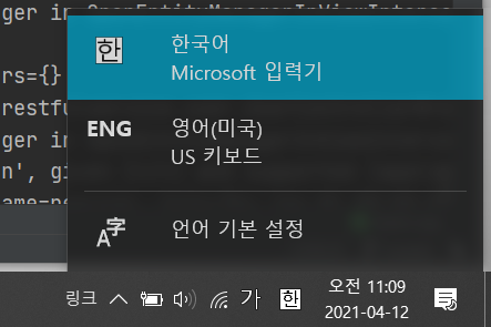 작업 표시줄에 "한" 이라고 되어있는 부분을 확인해보세요