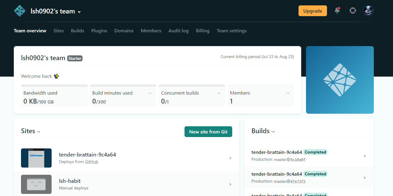 빌드 로그도 이렇게 확인할 수 있다. 만약 코드에 수정사항이 생긴다면 아까 연동한 깃 레포지토리에다가 git push 만 해주면 알아서 자동으로 재빌드가 진행된다. (진짜 편하다....)