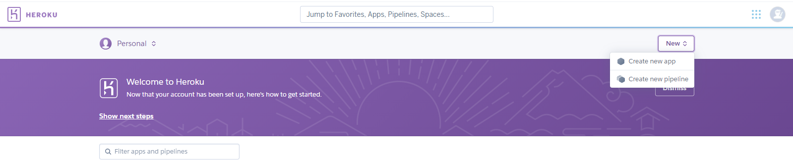 먼저 heroku에 로그인하고 Create new app을 통해 새로 앱을 하나 생성한다.
