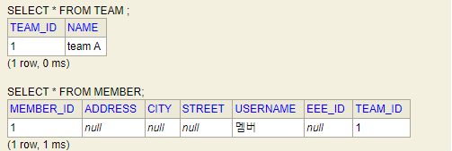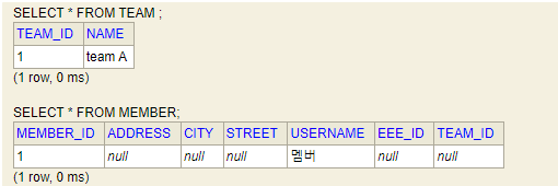 2를 주석 처리하고 1을 실행해보면 결과는 값이 들어가지 않는다. 연관관계의 주인이 아니기 때문이다.