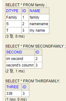 결과는 역시나 모든 필드가 한 테이블에 들어갔다. 만약 상속하는 클래스들이 많아진다면 상당히 비효율적일 수 있는 전략인 것 같다. 그래도 단순한 케이스에는 딱일듯 하다 ㅋㅋㅋㅋ