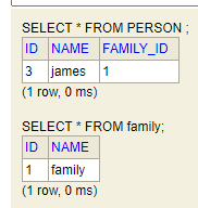 이렇게 한쪽 클래스에서만 JoinColumn을 해주면된다. 여러명의 person이 하나의 family에 속해있다고 설계하고 ManyToOne으로 매핑했다. JoinColumn의 name 옵션은 person테이블에서 family의 외래키 컬럼명을 무엇으로 할 것이냐이다.