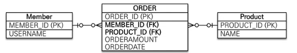 이렇게 해두면 중간에 MP_TABLE이란 테이블이 생긴다. 해당 테이블은 Member와 Product의 키를 외래키로 들고 있다. 하지만 문제는 연결된 테이블에 어떤 데이터를 추가하는 것이 불가능하기 때문에 거의 쓰이지 않는다.