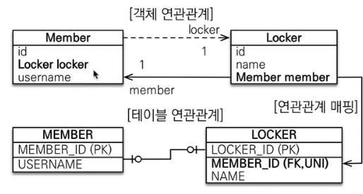 일대일은 주 테이블에 외래키를 두는것이 JPA 매핑하기 가장 편리한 방식이다. 다만 값이 없으면 외래키에 Null이 들어가는 것을 허용해야하는 문제가 발생한다.