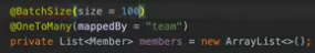 이제 result의 getMembers 를 하면서 순회를 하면 지연이든 즉시로딩이든 1+N 문제가 발생할 것이다. 이를 방지하기 위해서 @BatchSize라는 것을 사용하면 된다.