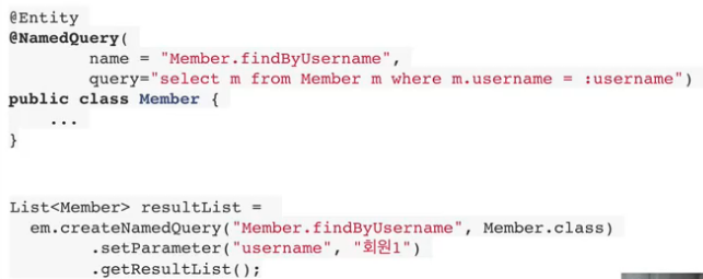 이런식으로 쿼리에다가 Member.findByUsername이라는 이름을 붙여서 코드 내에서 이름으로만 편하게 사용하는 것이다. 장점이라면 컴파일 시점에 쿼리를 검증하여 에러를 잡아준다는 점이다. 하지만 JPA의 네임드 쿼리는 불편해서 추후에 스프링 데이터 JPA의 네임드쿼리를 배우는 것이 좋다.