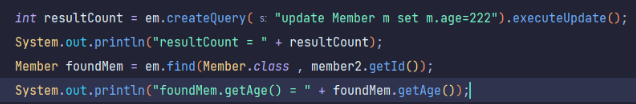 벌크연산은 이처럼 데이터베이스에 JPQL로 쿼리를 바로 날려버리는 것이다. 이를 통해 영속성 컨텍스트를 거치지 않아서 1+N 문제가 발생하지 않는다. 주의할 점이라면 바로 디비에 날리는 거라서 변경사항이 영속성 컨텍스트에 반영이 되지 않기때문에 위에서 getAge를 통해 나이를 출력해보면 222로 업데이트 되기 전의 나이가 나올 것이다. 그러므로 벌크 연산을 수행한 후에는 꼭 영속성 컨텍스트를 초기화해줘야한다!!