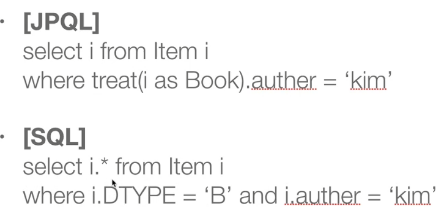 String query = "select i from Item i where treat(i as Book).author = 'kim'"