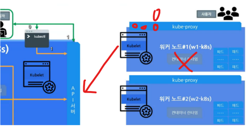 그림을 통해 다시 생각해보면 컨테이너 런타임이 죽는다면 워커노드의 쿠버렛은 이를 인지하고 API 서버에 알려주고 스케쥴러가 이를 확인하여 문제가 발생한 워커노드에는 파드를 배정해주지 않는다. 처음에 봤었던 쿠버렛이 죽었을 경우에는 쿠버렛이 이를 알려주지 못해서 API 서버는 이 사실을 모르니 계속 Pending 상태로 남는 것이다.