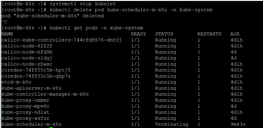 워커 노드에서 쿠버렛을 삭제할 때와 똑같다. 먼저 systemctl stop kubelet으로 쿠버렛을 멈춘다. 그 다음 쿠버렛의 스케쥴러를 삭제한다. 그럼 삭제가 진행되지 않는다. 이유는 쿠버렛으로 삭제 명령어가 날아가서 실행되어야 하는데 (마스터 노드의 쿠버렛은 컨트롤러 매니저 스케쥴러 등을 관리함 얘네도 파드니까!!) 쿠버렛이 멈춰있으니 삭제가 진행되지 않는 것이다.