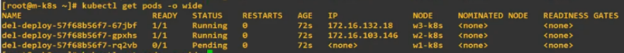 워커 노드중 하나에 들어가서 systemctl stop kubelet을 해보자. 마스터 노드에서 deploy를 생성하려고 하면 하나가 펜딩상태로 나온다. 방금 한 워커노드의 kubelet을 중단시켰기 때문이다.