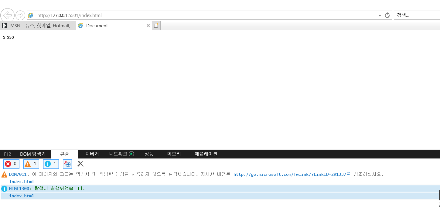 nodejs 에서는 require과 exports로 가능하고 ES2015에서 나온 표준 모듈 시스템은 import와 export로 한다. 근데 이러한 방식은 모든 브라우저가 지원하는건 아니다. 그놈의 ie ㅋㅋㅋ 위의 동일한 코드를 ie에서 열어보겠다.