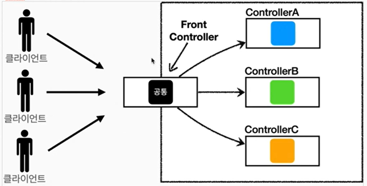 - 프론트 컨트롤러 서블릿 하나로 모든 요청을 받음