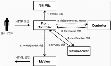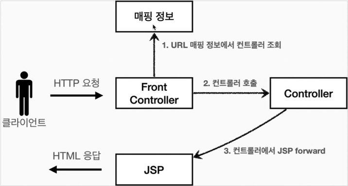 프론트 컨트롤러 ▶ 컨트롤러 호출, 컨트롤러는 MyView 반환 ▶ 프론트 컨트롤러로 다시 돌아와서 ▶ 전달받은 MyView로직 호출 ▶ MyView 가 JSP로 forward